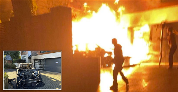 发现情况不对后,车主和邻居试图用花园水管灭火,但锂电池起火特别困难,最终导致车辆完全烧毁,并影响车库门。最后,消防队员赶到,控制了火势。否则车主的房子恐怕也要付之一把火炬。。