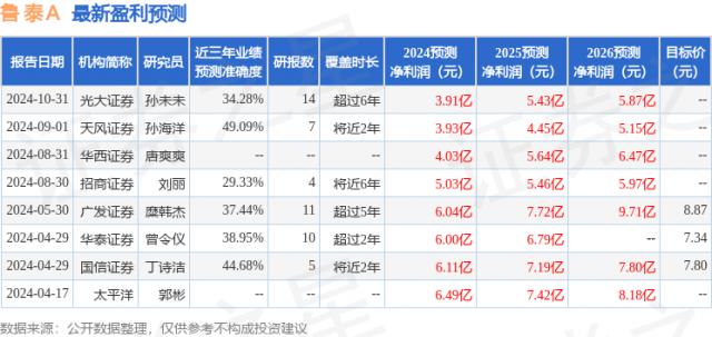 根据证券之星数据中心近三年发布的研究报告数据,TF证券孙海洋研究员团队对该股进行了深入研究,近三年的预测准确度均值为 预测49.09% 2024 年度归属净利润为利润 3.93 十亿,根据现价转换预测。 PE 为 13.12。