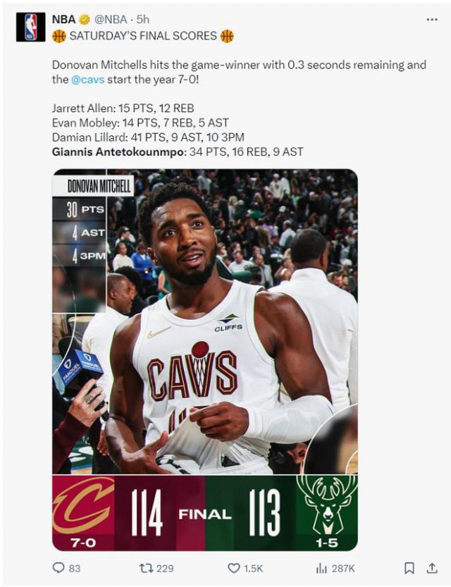 雄鹿 113-114 在这场比赛中,米切尔完成了四连败, 0.3 第二次准绝杀中投,他成了骑士的大英雄。里弗斯吞下了自己教导雄鹿到现在的东西。 20 胜 28 负面,他的下课倒计时似乎已经开始了。
