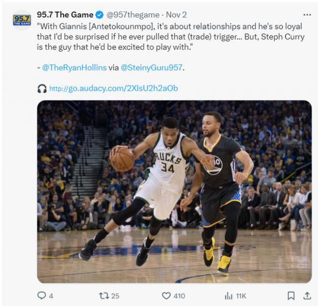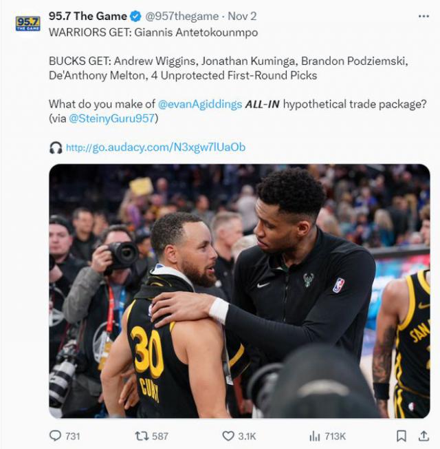 勇媒 95.7The Gmae 对扬尼斯来说,这是一个忠诚的问题,如果他申请交易我会感到惊讶,但是库里是那种他很乐意和同事交易的球员。