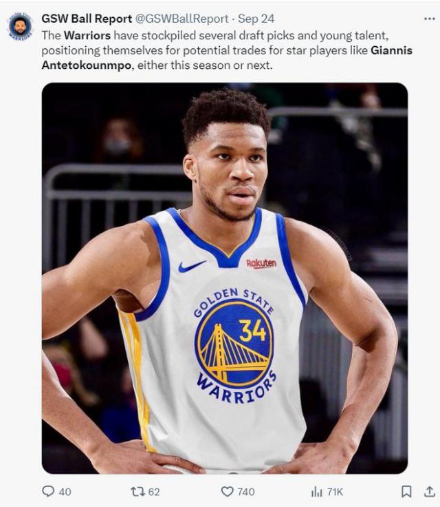 休赛期开始,扬尼斯和勇士之间的绯闻接踵而至。勇士囤积了许多年轻的资产和选秀权,等待交易到像扬尼斯这样的超级明星联合库里。勇士管理层希望在库里下滑之前帮助他再赢一个冠军。