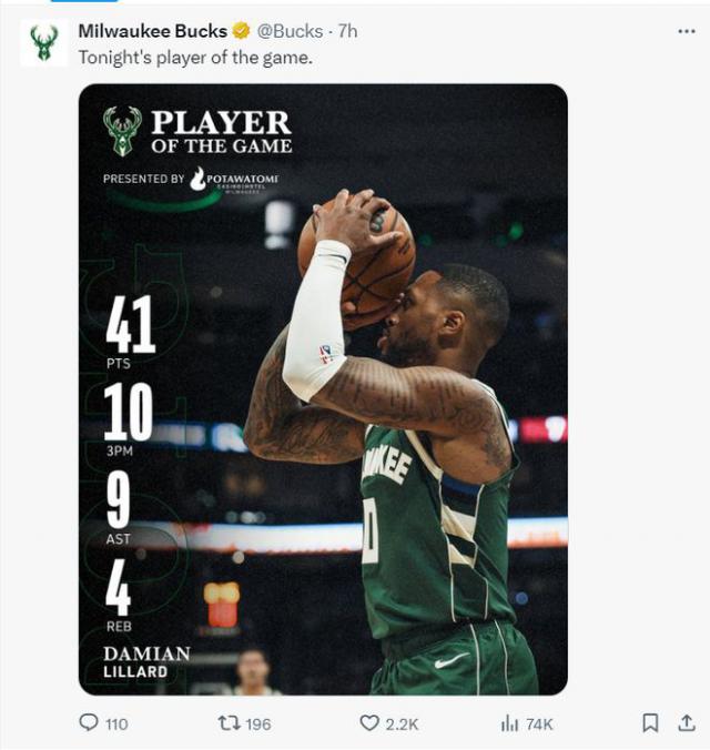 利拉德 24 中 13 三分 15 中 10 拿到 41 分 9 助攻 4 篮板,扬尼斯 27 中 15 拿到 34 分 16 篮板 9 助攻很难找到一场胜利,这只雄鹿还是冲冠球队吗?双核已获得。 75 分数都不能赢,里弗斯的执教能力是否值得字母哥信任?