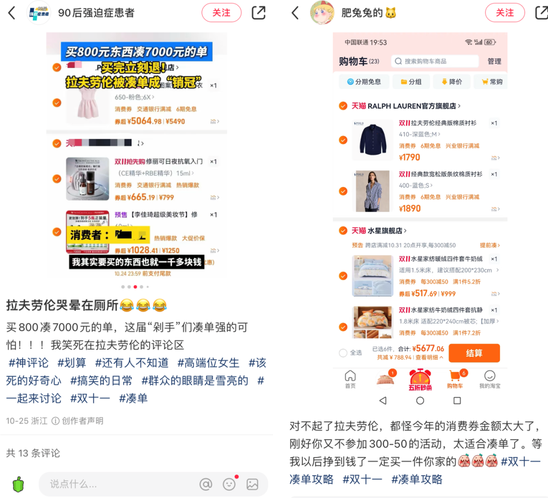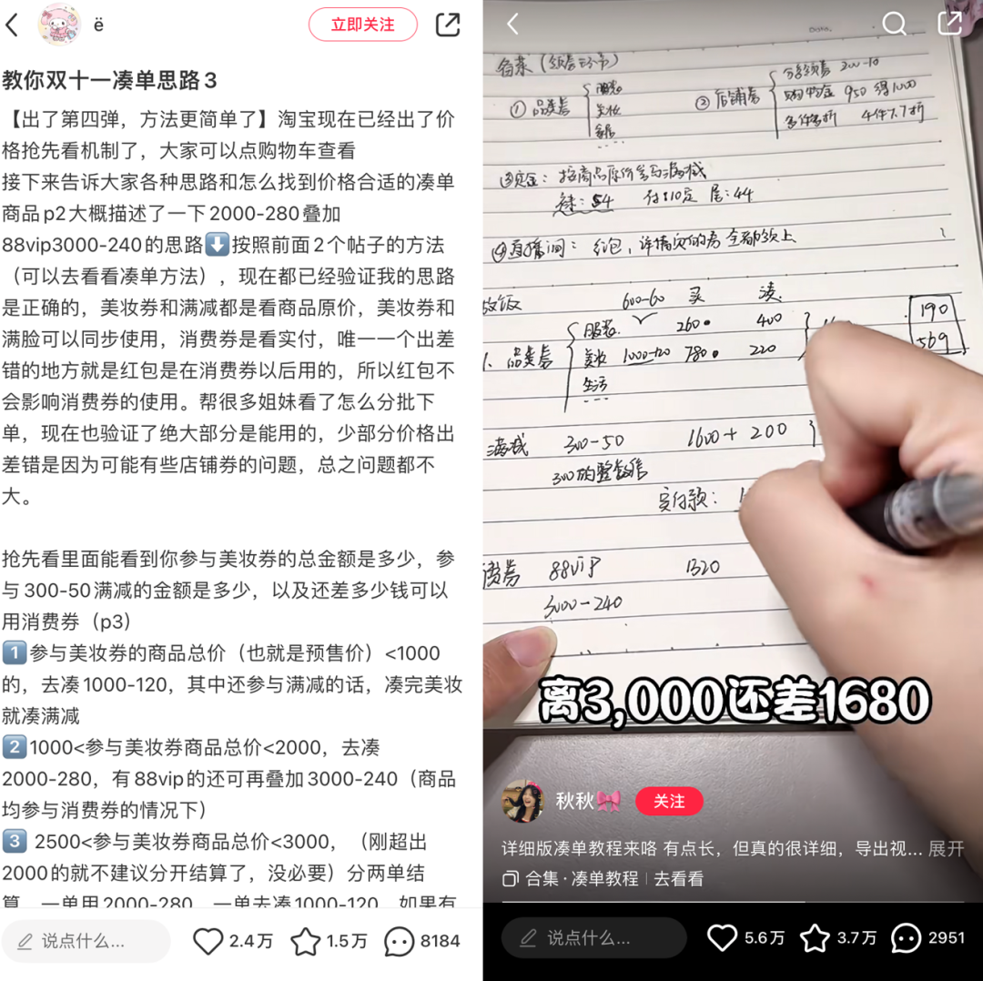 透过“先凑再退”,顾客确实体验到了相对较低的价格,但是由于复杂的凑单过程消耗了心力。在长期的弊端下,在今年的双11和淘天的折扣规则中,我们试图向88VIP客户发放3000减2400。、满7000减560的大额满减券,两种消费券可以叠加使用,这也无形中增加了凑单的难度。很多网友也逐渐在抖音、小红书等社交平台上分享了自己的收单经验,仅在小红书上,“双11满减攻略”这个词条就收录了20,000个笔记,如何通过收单最大限度地获得低价,更是被整理成详细的教程。