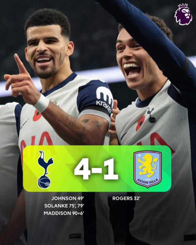 热刺主场 4-1 击败阿斯顿维拉。奥纳纳头球中柱,罗杰斯破门,孙兴逊助攻约翰逊扳平比分,罗梅罗伤退,索兰克 4 分钟 2 球队,理查利森也受伤了,麦迪逊替补上场任意球直接破门。