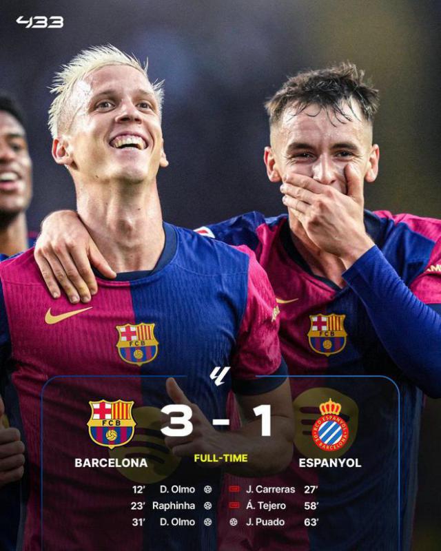 西甲第 12 巴萨主场的轮子 3-1 击败西班牙人,各种比赛。 6 连胜,继续领先。亚马尔助攻,奥尔莫梅开了两次,拉菲尼亚做出了贡献,卡雷拉斯和特耶罗的进球被吹了,普阿多扳回了一球,法蒂的进球越位在第一位无效。