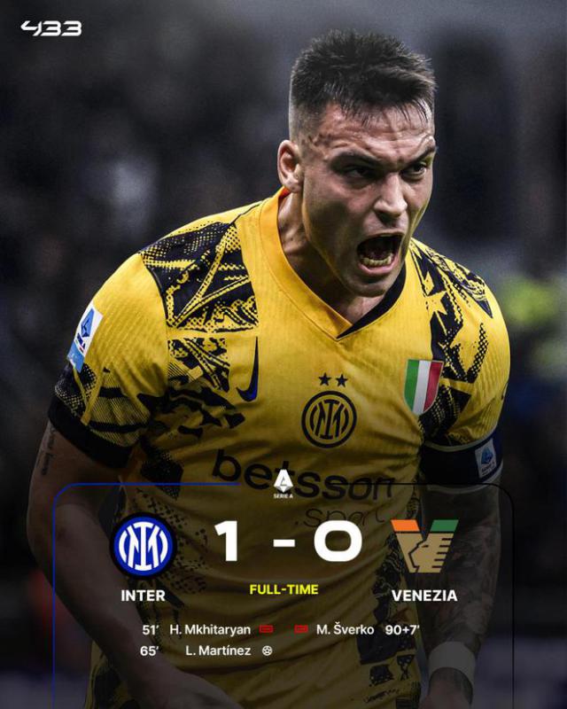 意甲第 11 轮子,国际米兰主场 1-0 小胜威尼斯,6 轮 5 胜 1 平无败位居第二。姆希塔良的进球越位被吹,劳塔罗打破了主场球荒,威尼斯在绝平中被吹手球无效。