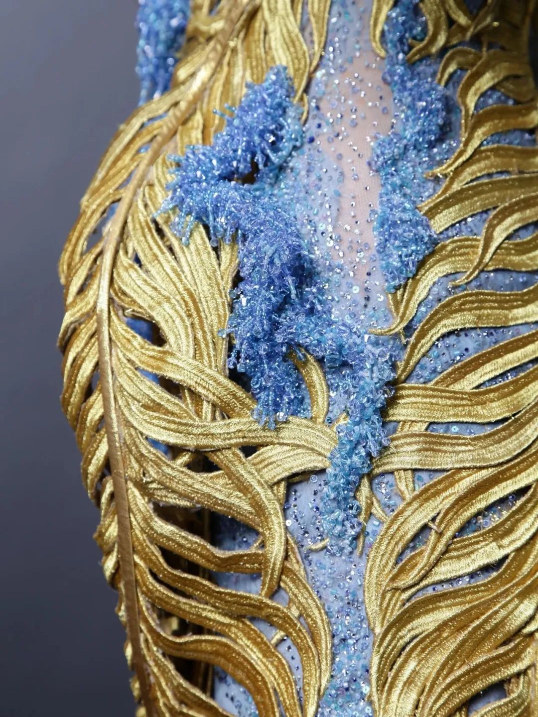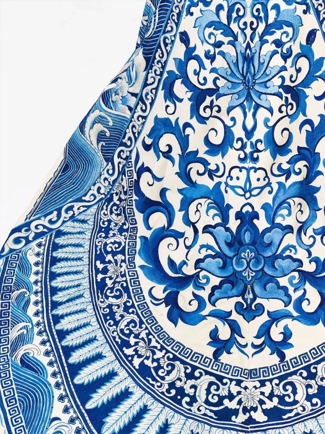 祥云纹、水纹、莲花纹等图案在“青瓷”礼服上都是手绘面料和手工刺绣呈现的。