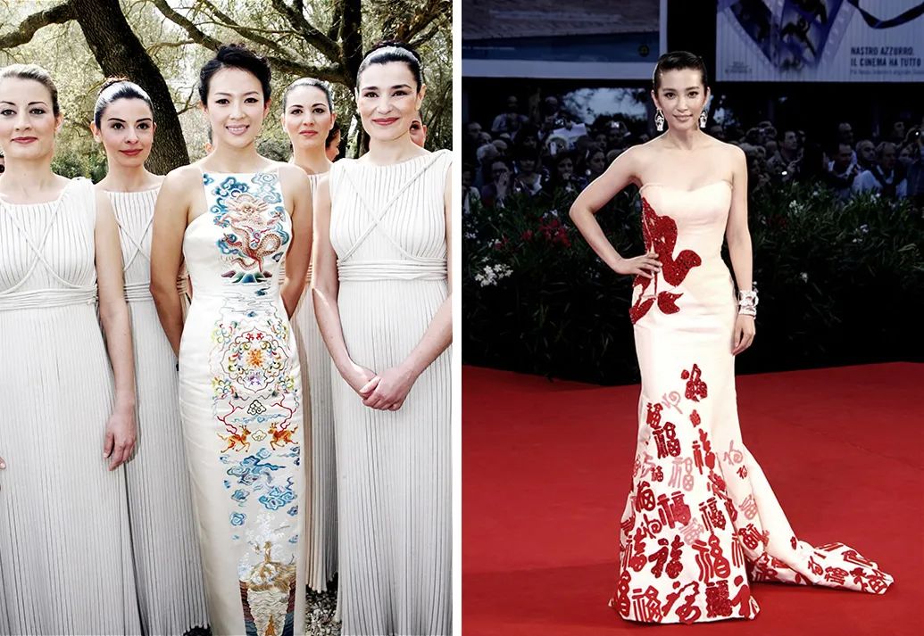 左:章子怡参加雅典圣火采集仪式右:李冰冰穿着“百福礼服”走在威尼斯电影节的红毯上。
