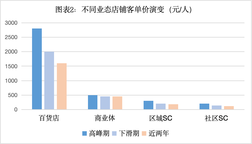 在第四档和传统百货公司中,一些相对规范的传统百货公司与其业态的高峰期进行了比较,客户数量从2500元减少到3000元。经过2000元左右的短暂过渡区间,迅速降至目前1000元至1800元的区间,呈现出加速下滑的趋势,反映出传统百货公司产品质量价比老化、品牌升级业务创新组织能力不足的问题。这个判断也是从定性分组采访的反馈结果中验证出来的。大家都提出传统百货公司是否高、低、时尚不足,即品牌个性和服务性价比没有提高,而价格居高不下。
