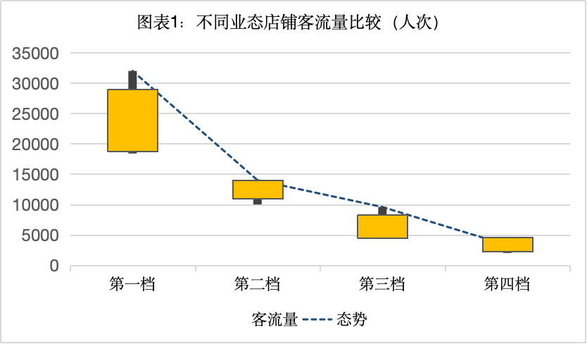 根据商店销售业绩、客户订单数量和客户流量的统计比较,在商店经营面积相对接近的前提下,选择客户流量和客户订单数量的变化水平,生成以下示意照片。
