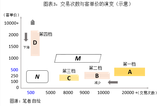 参考图3,纵观客户订单数量与交易次数的相关性,第一档发展稳定,第二档客流略有下降,交易次数保持稳定,第三档整体相对稳定,传统百货公司是综合价值下降最明显的。