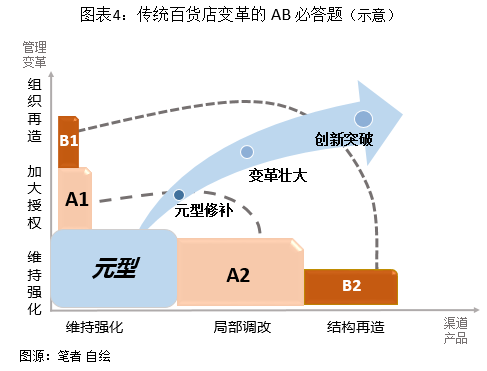 如图4所示,目前的行业趋势是A2。、B2的选项希望通过局部业务内容的调整和表面环境的改造,在不改变授权和组织机制的前提下,获得业务利润。多年的实践证明,传统百货公司很难找到经典案例进行局部升级和调整。