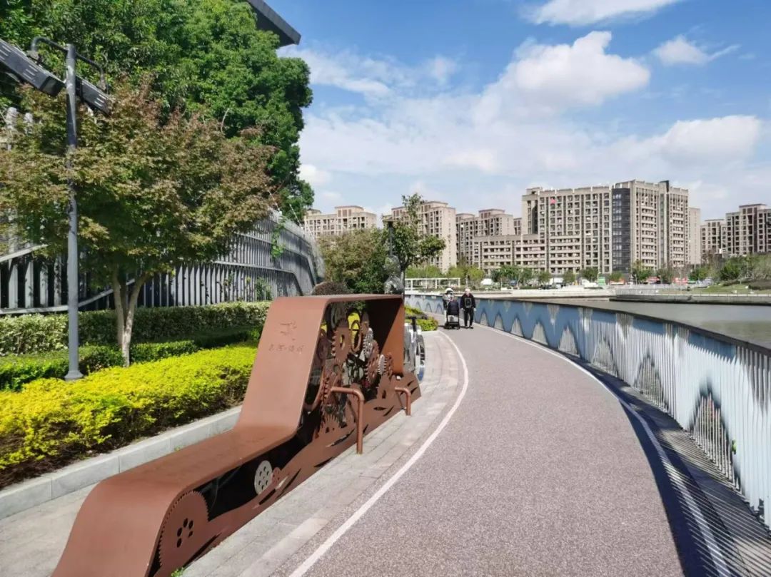 波纹风格的亲水围栏像动态水流一样向远处延伸,与不断流动的苏河相得益彰。齿轮连接的代表雕塑映入眼帘,展现了苏州河工业发展的特色。坐在别出心裁的雕塑座椅上,感受河面吹来的微风,从另一边俯瞰。苏河两岸宁静美丽的风景一览无遗。