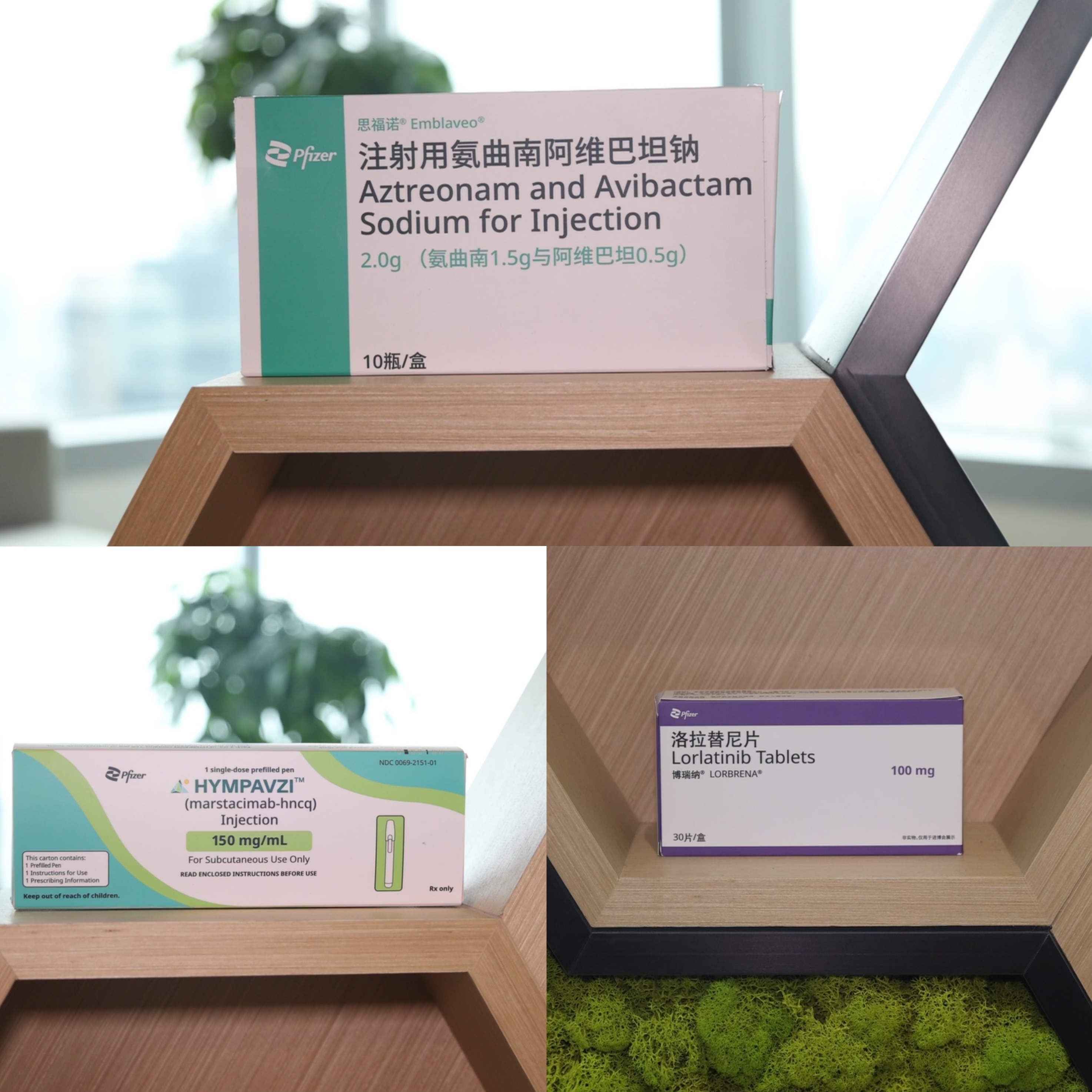 辉瑞将是世界上第一个第三代ALK抑制剂洛拉替尼(右下),在中国国际进口博览会上首次亮相的思福诺(注射氨曲南阿维巴坦钠)(上)血友病疗法马塔西单抗(左下)