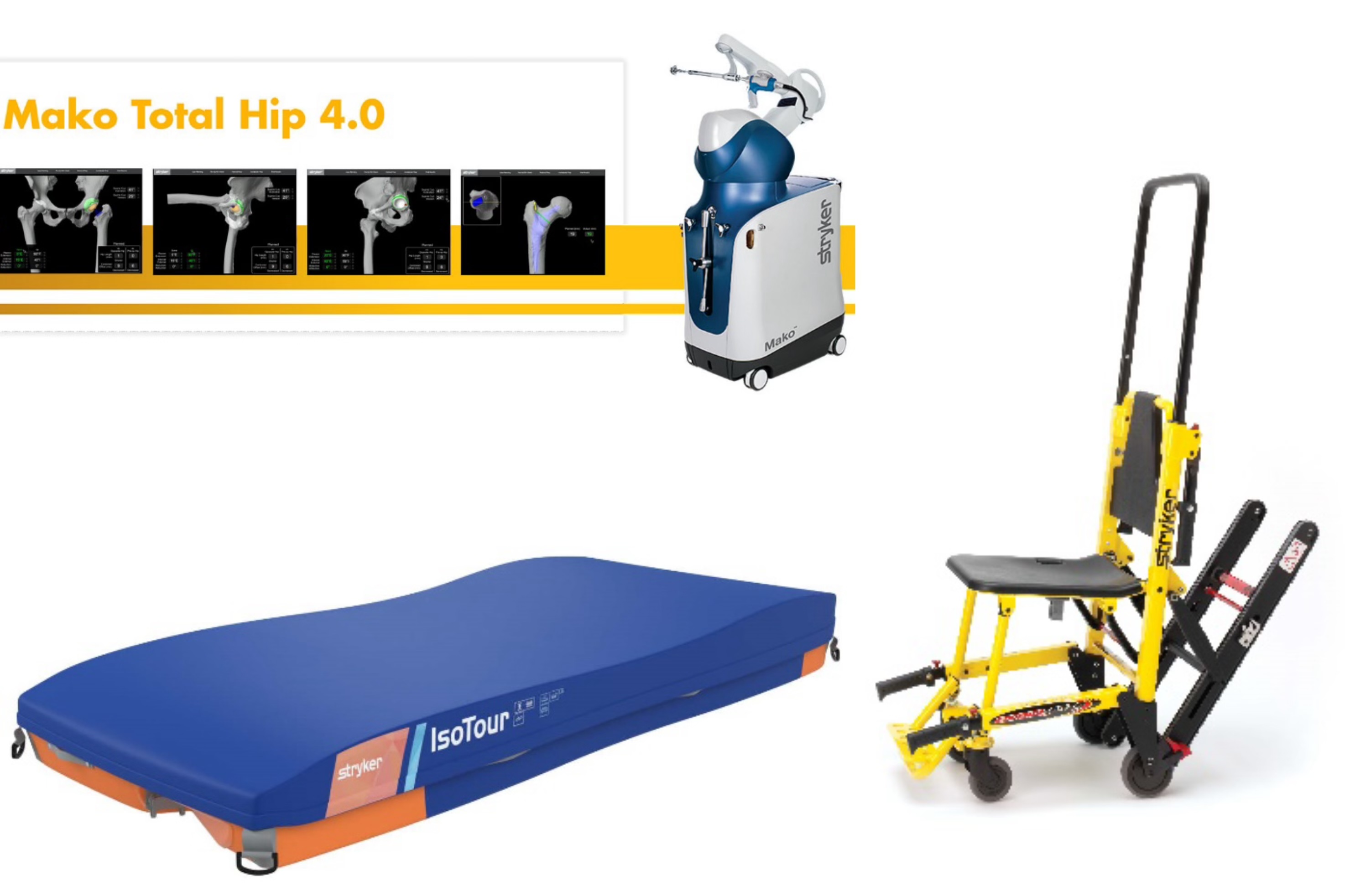 Mako智能关节机器人全髋关节置换术将在中国国际进口博览会上首次在中国展出。(THA)4.0防褥疮翻盘床垫(左下)系统(左上)Stair-Pro楼梯担架(右)本文图片均为受访者提供图片。