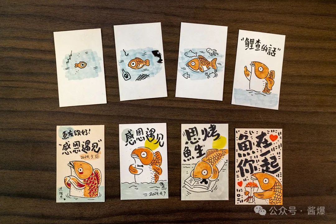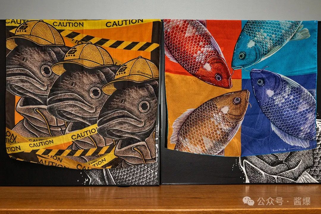 “落地密码”背包、“锦鲤附身”装饰、“翘首以待”装饰画、“包头鱼巾”方巾,以及写有幽默话语的名片,如“鲤鱼查”、“想烤鱼生”、“鱼在一起”、“鱼友你好”等。