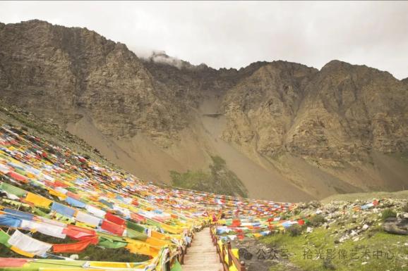 旅途中,在恰央措冰河中拍摄经幡和上山栈道。