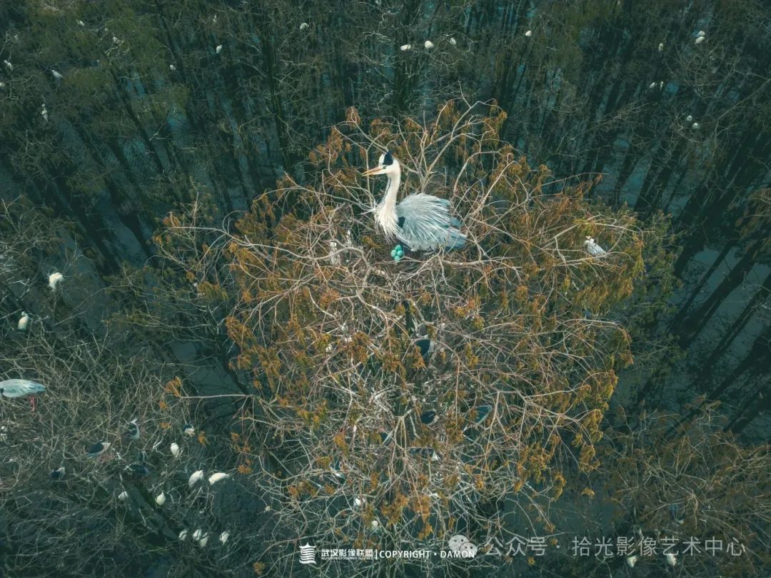 在清澈的湖水中保护着尚未孵化的鸟儿,湖水清澈见底,水中的枝叶像鸟巢一样包裹着鹭。