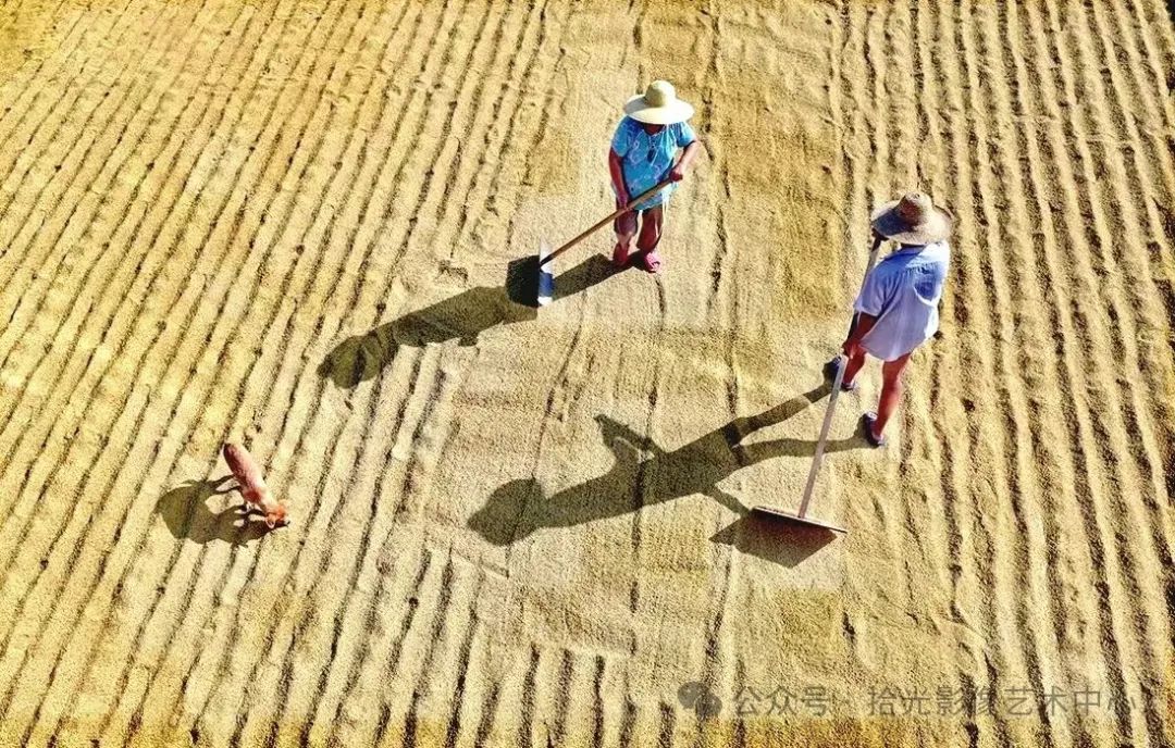 从航拍的角度来看,金色的麦田就像一幅幅油画在大地上展开。