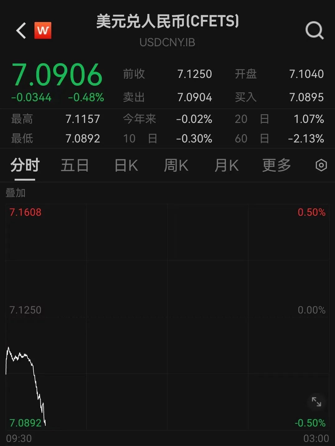 十一月四日开盘,在岸人民币和离岸人民币对美元的汇率都大幅上升。截至发稿时,在岸人民币汇率报告为7.0906,上升344个基点。