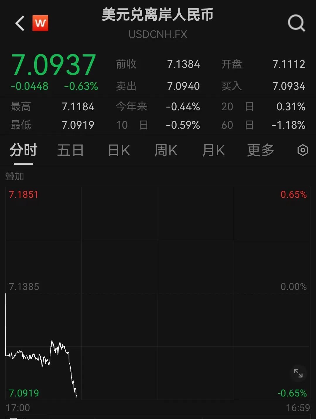 离岸人民币汇率连续7.11、7.102个关口,目前报7.0937,上涨447个基点。今日,人民币对美元的中间价格为7.1203,下跌68点。