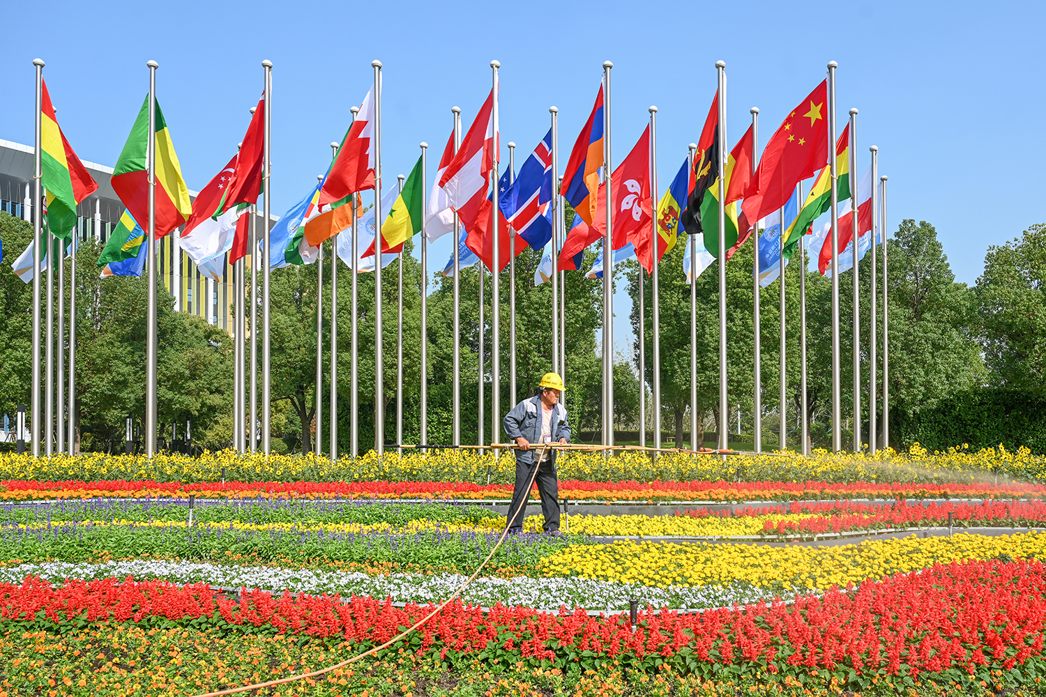 国家会展中心(上海)于2024年11月3日,工作人员正在给花浇水。本报记者 朱伟辉 图