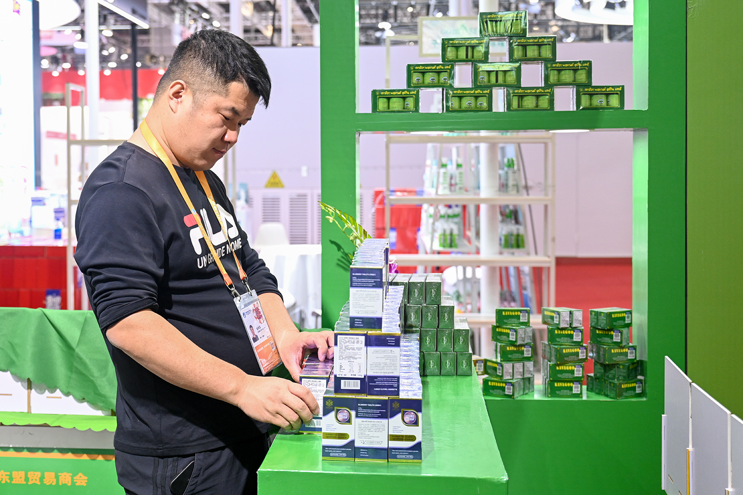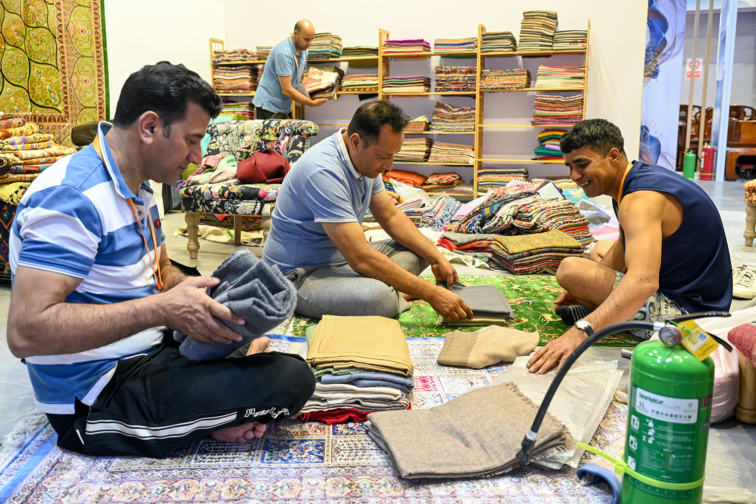 2024年11月3日,连续七年参加国家会展中心(上海)的印度展商正在整理面料。本报记者 朱伟辉 图