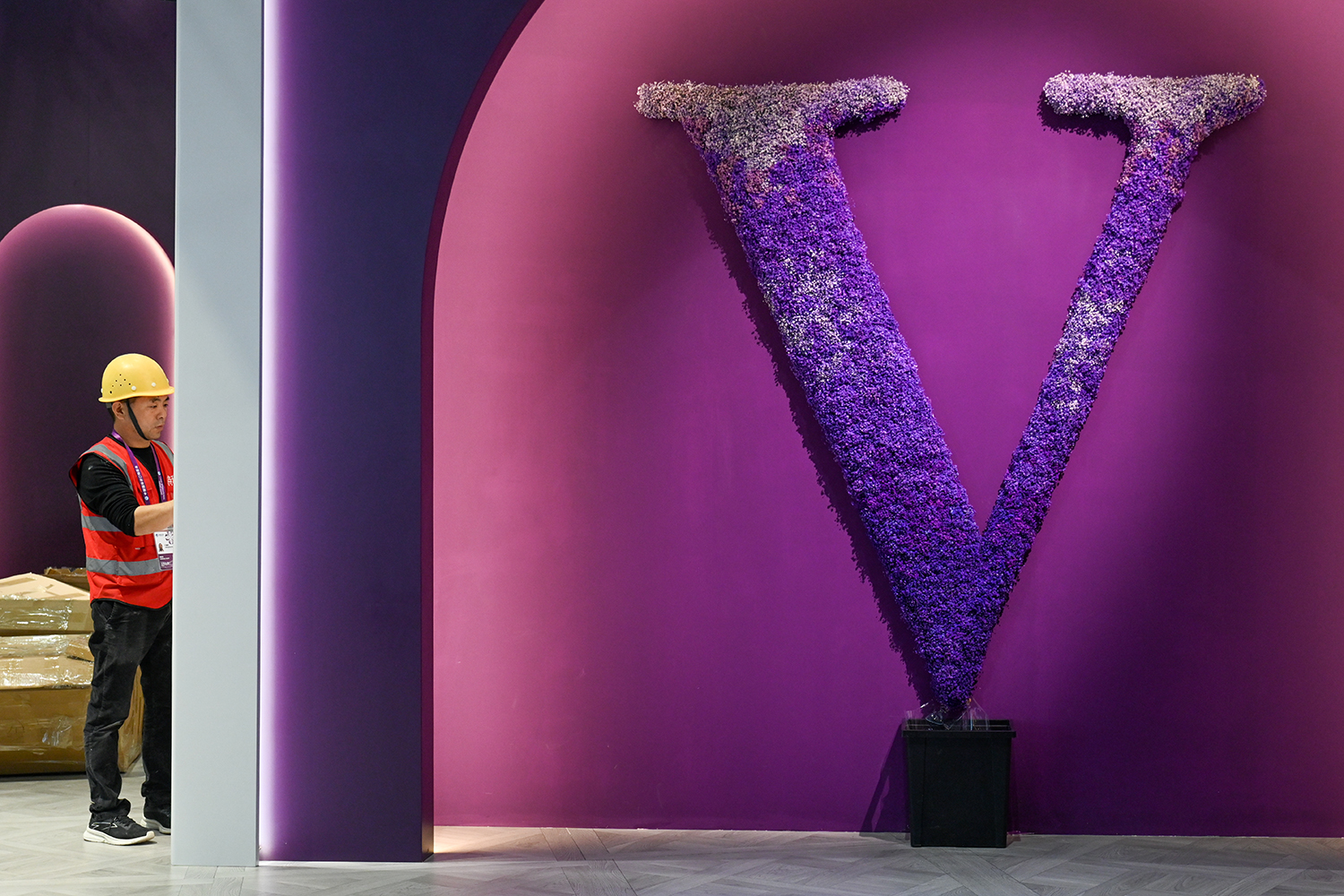 国家会展中心(上海)于2024年11月3日,V MUSE珠宝展台,工作人员正在进行清洁。本报记者 朱伟辉 图