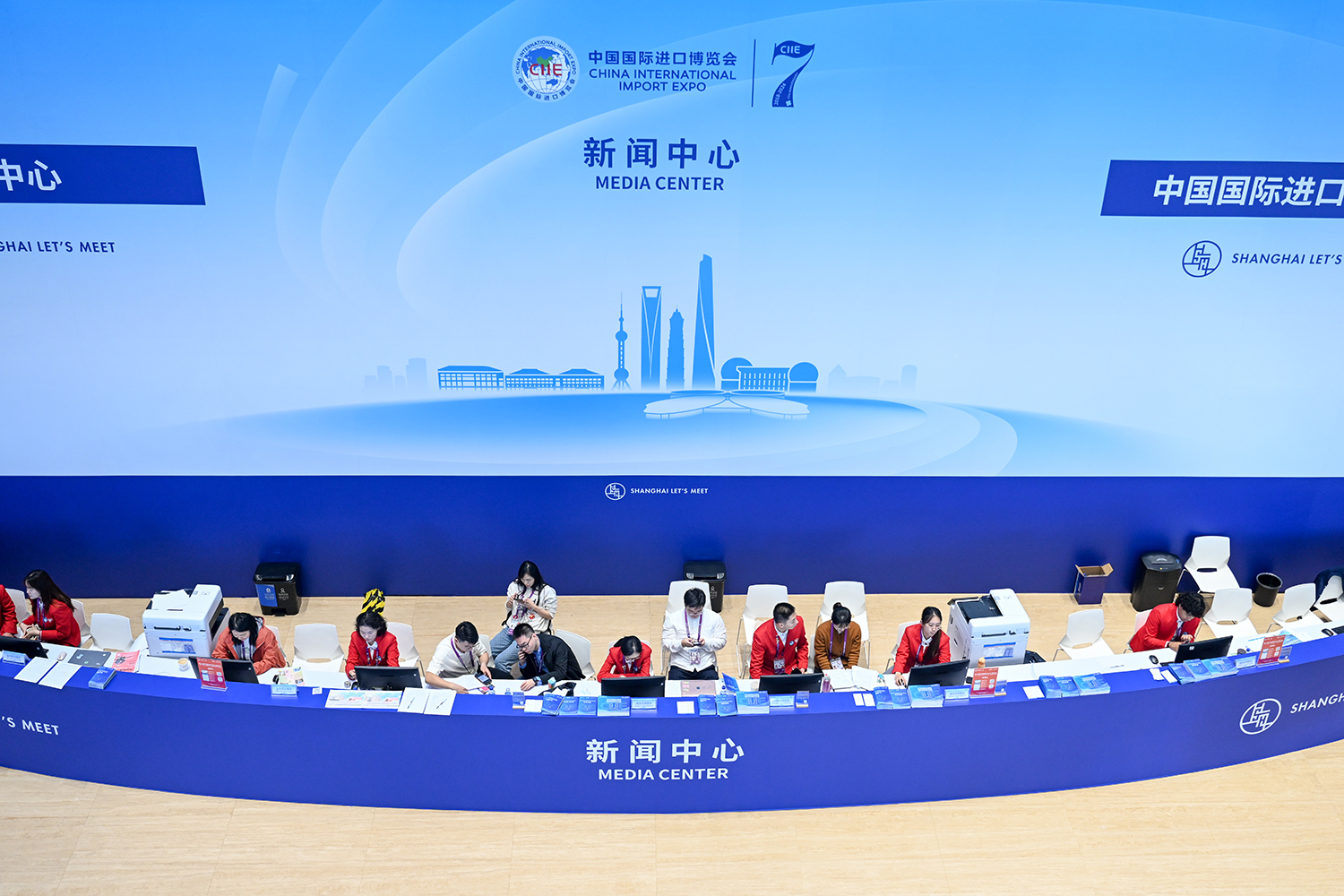 国家会展中心(上海)、第七届中国国际进口博览会新闻中心于2024年11月3日正式向中外媒体记者开放。本报记者 朱伟辉 图