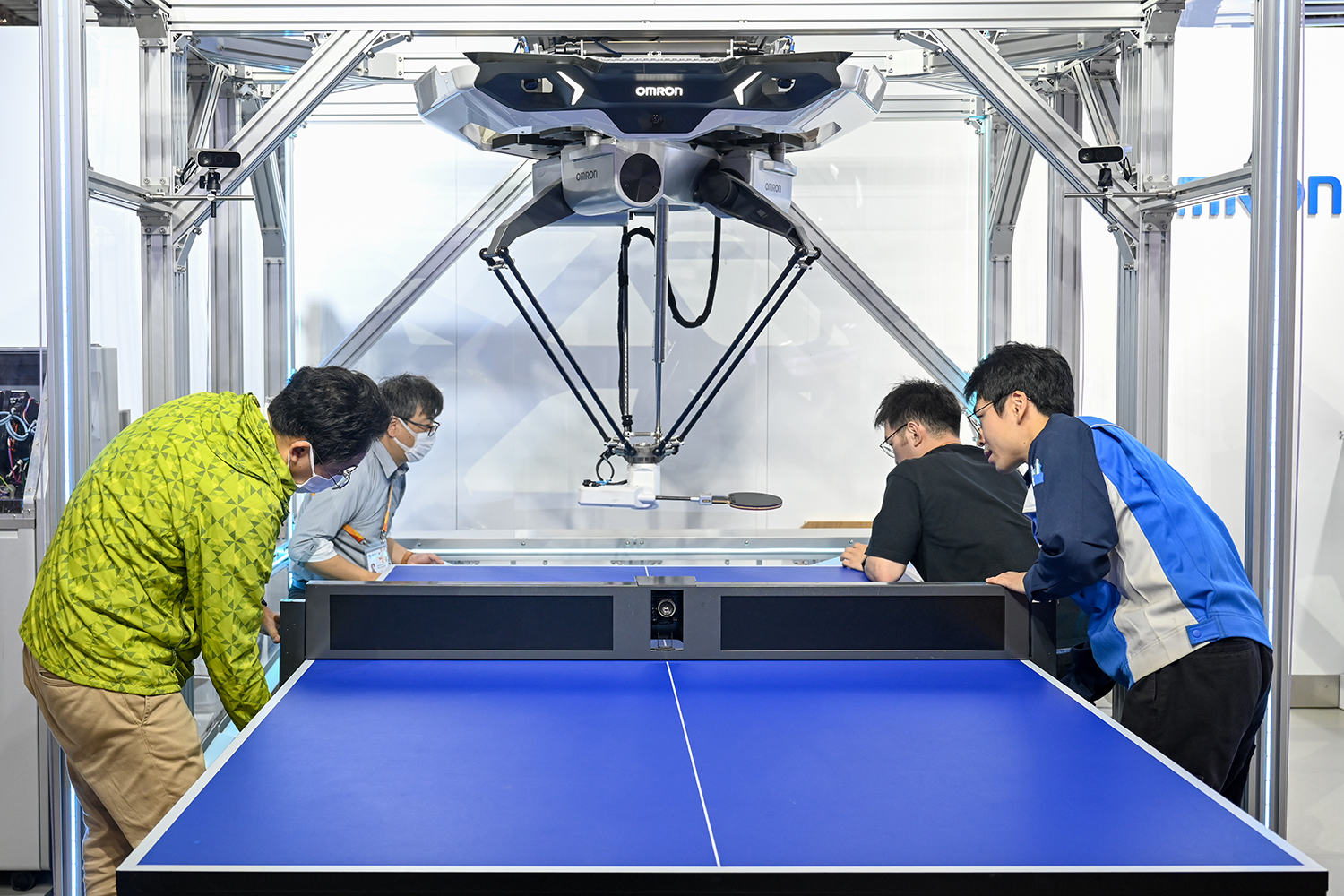 国家会展中心(上海)于2024年11月3日安装了欧姆龙FORPHEUS乒乓球教练机器人。传感器、并联机器人和机器人控制器在FORPHEUS上代表了核心技术的呈现。在与玩家互动的过程中,玩家的心率、面部情绪、眨眼次数等。会显示在球网屏幕上,玩家的能力会根据玩家的水平进行测量,从而逐步提高玩家的球技水平,通过机器人激发人类的潜力,呈现人机融合的未来。报纸记者 朱伟辉 图