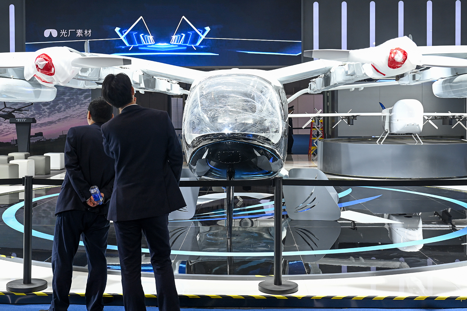 2024年11月3日,国家会展中心(上海),御风未来展位,重量级电动垂直起降飞机M1,本届中国国际进口博览会最大展品。 eVTOL。M1身穿黑白涂装,翼展15米,身长10米。可以实现全自动无人驾驶航行,单次充电可以航行250公里,巡航速度可达200公里/小时。据参展商介绍,从中国国际进口博览会所在地的国家会展中心(上海)飞往上海浦东的临港、张江或苏州市中心,只需15分钟。报纸记者 朱伟辉 图