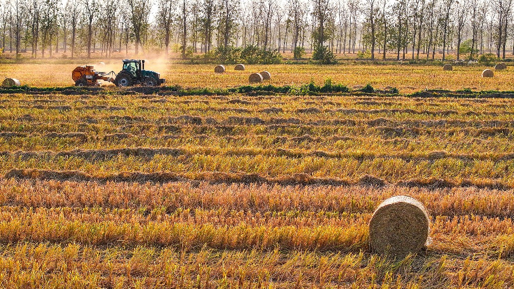 2024年10月31日,江苏省宿迁市泗洪县孙园镇一稻田,稻草打捆机来回穿梭,收集稻草。视觉中国 图