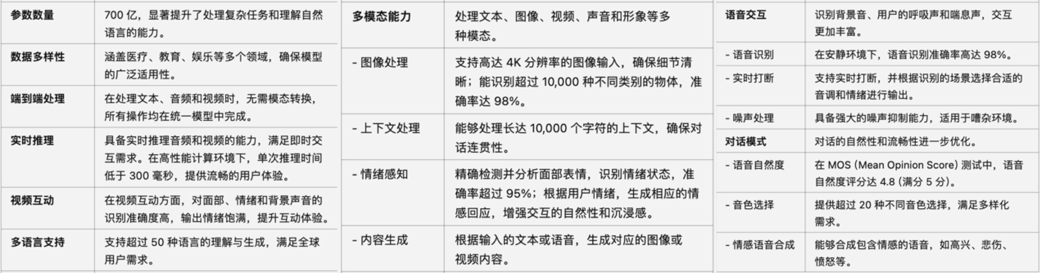 根据官方公开数据,DUIX ONE是一种70B参数多模态模型,模型具有端到端的处理能力,在文本、音频和视频处理过程中不需要模态转换。DUIX ONE支持多模态能力,包括文字、图像、视频、声音和图像处理,能识别10,000多种不同类型的物体,识别准确率达到98%。就实时交互而言,DUIX ONE具有良好的音频和视频推理能力,一次推理时间小于300ms。同时,该模型具有先进的情绪感知功能,能够准确检测和分析面部情绪。情绪识别的准确率超过95%,并能产生相应的情绪反应,使人机交互更加自然生动。