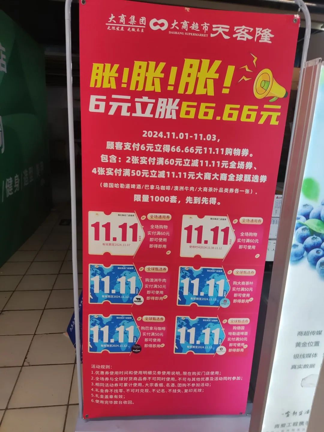 在线渠道享受专属折扣,沿着麦当劳和星巴克从餐饮业吹到连锁超市。北京一家天客隆超市,入口处挂着“6元66.66元”的牌子。从店里的服务员那里了解到,这个活动不能用现金结算。