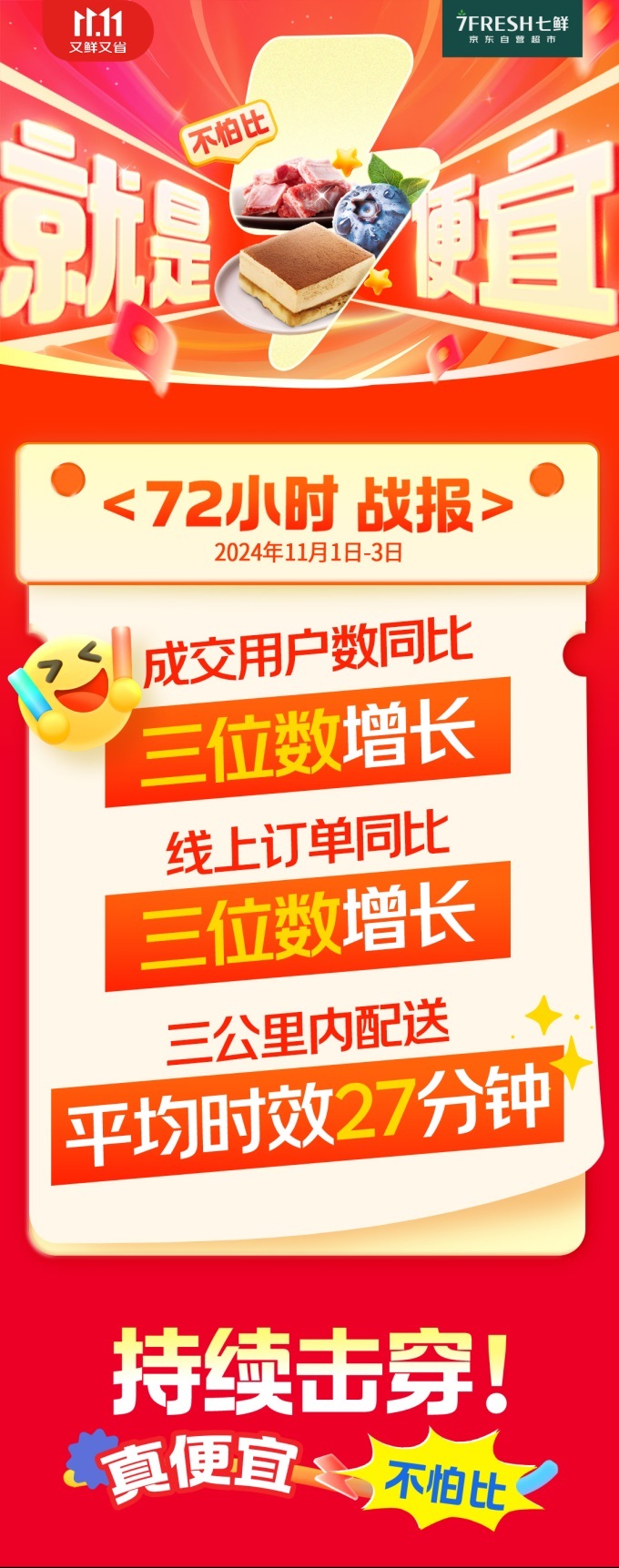 11月1日,JD.COM七鲜超市正式启动“非常透明”活动,成功吸引大量消费者以“真便宜无所畏惧”的极致低价参与。仅72小时,网上订单数量和交易用户数量均实现同比增长三位数,水果、蔬菜、水产品、肉禽蛋等多品类爆款销售至脱销。