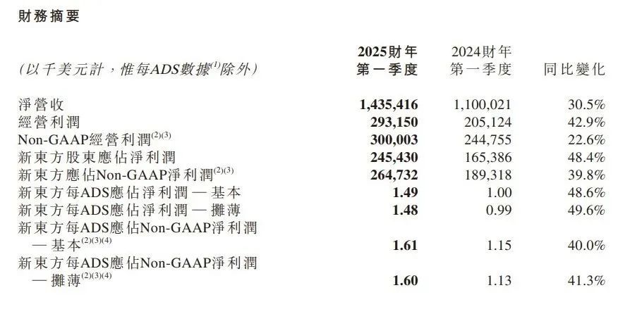 例如,新东方2025年最新一季度财务报告。 财年Q1净收入达到14.354亿美元,同比增长 30.5%;经营利润达 2.932 亿美元,同比增长 42.9%。美好的未来 2025 财年第二季度营收为6.194亿美元,同比增长 50.4%。净利润 5740 一万美元,同比增长 51.5%。