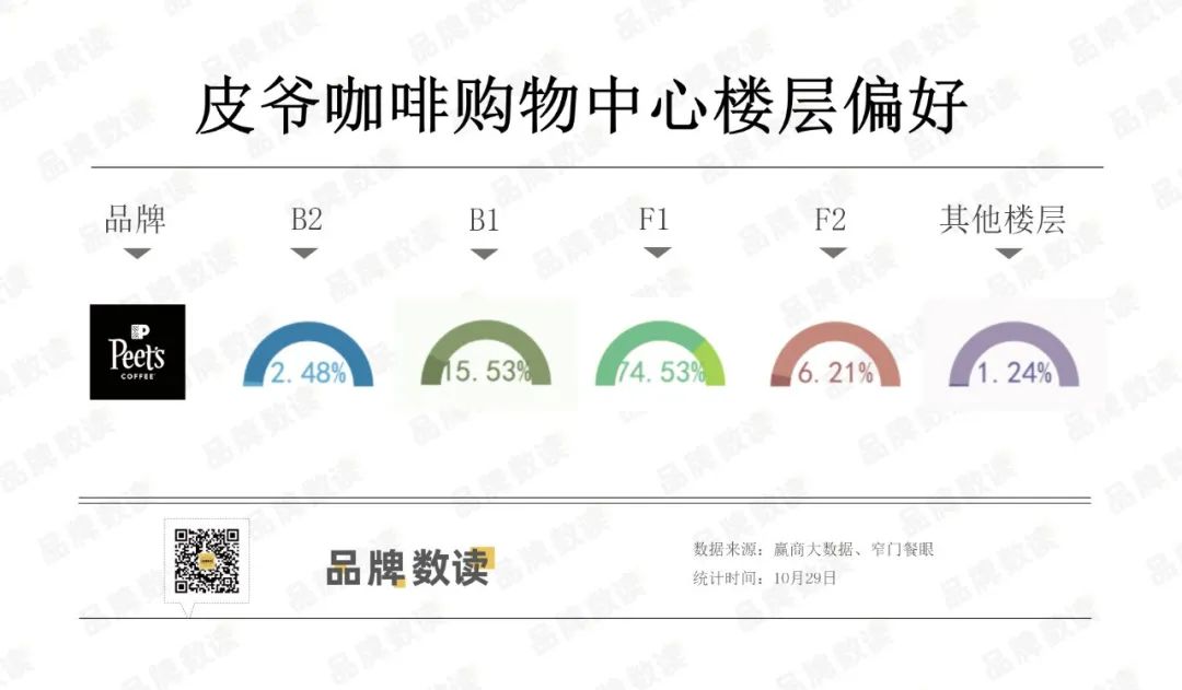 但是在楼层选择上,皮爷和星巴克差不多,都是商场一楼开店的首选。数据显示,皮爷咖啡位于一楼的门店数量最多,占门店总数的近3/4。一位投资者告诉品牌数量,皮爷甚至会选择在某些点附近开店,利用星巴克已经建立的品牌知名度和流量来提升自己的营销和知名度。