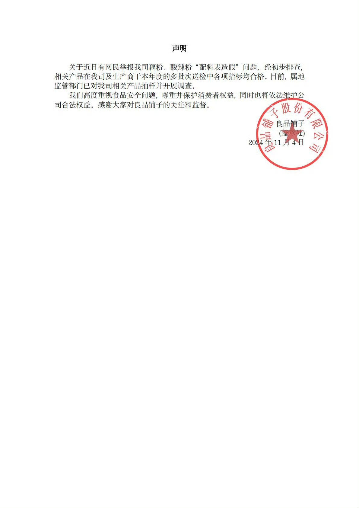 11月4日下午,好店利用其官方微博发表声明称,经初步调查,公司及厂家今年多批次送检相关产品各项指标均合格,有网友近日举报好店莲藕粉、酸辣粉“配料表造假”。当前,地方监管机构对公司相关产品进行了采样和调查。良品店表示,公司高度重视食品安全问题,尊重和保护消费者权益,同时也将依法维护公司的合法权益。