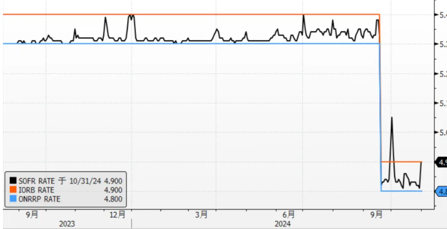 月末SOFR的飙升也表明美元的流通正处于紧张状态。SOFR在9月末一度飙升至5.05%,超过了天花板IORB(4.9%)的15bp,但SOFR也在10月底飙升至4.9%,而在过去的非季末一个月。
