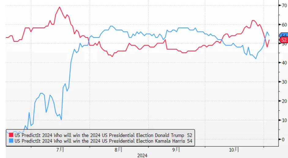 最重要的是看大选的结果。随着每周提前投票的结果陆续公布,哈里斯获胜的概率开始赶上川普,美元周一上午明显下跌。