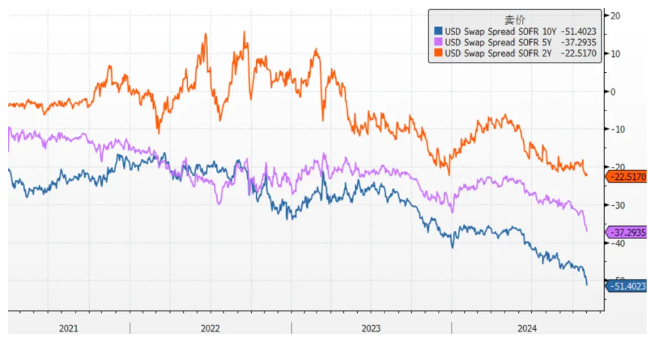另外一个指标是swapp spread(SOFR同期限 IRS 与美国债券收益率的差额)持续下降,美国债券收益率高于利率交换,这表明随着美国财政赤字的不断扩大,银行的资产负债表容量很难承担美国所有债券的供应。