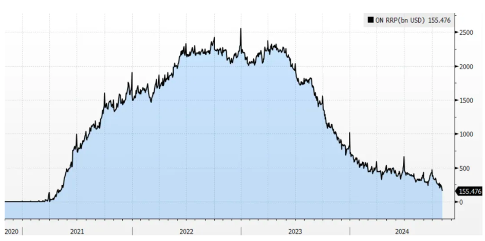 另外,美国债券市场的流动性也有问题。美联储逆回购的使用量自 2021 年初以来第一次下降 1550 一夜之间,亿美元下跌了460亿美元。