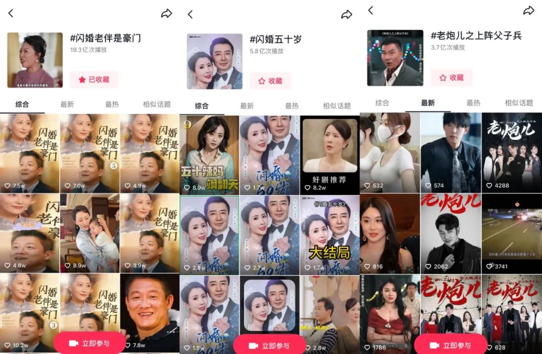 其中,短剧《闪婚妻子是豪门》累计播放量超过5.5亿,曾登上全网短剧人气TOP1之巅,抖音话题播放量甚至达到19.3亿。制片人听花岛说:“致力于做好中老年人的造梦工作。