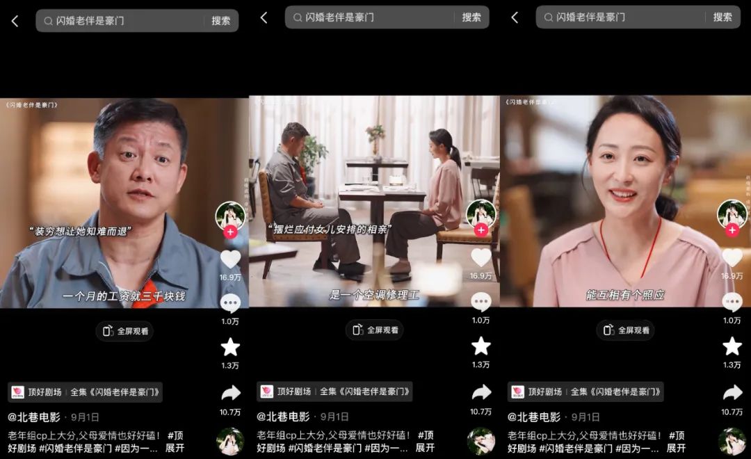 今年9月,一部名为《闪婚妻子是富裕家庭》的短剧(现在更名为《真爱不怕晚》)在社交平台上占据了主导地位。这部剧的主要故事是:在一次街头偶遇中,卖盒饭的石小秀遇到了雷志远的养女雷梦洁。他们加了微信,在雷梦洁的牵线搭桥下,小秀去和霸总相亲。然后,他们开始了“黄昏恋爱”。