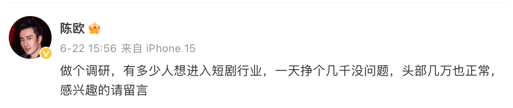 直到去年10月,有报道称,陈欧正在建立一个短剧平台,推动版权交易。他甚至在微博上研究了有多少人想去短剧行业,说“一天几千没问题”。