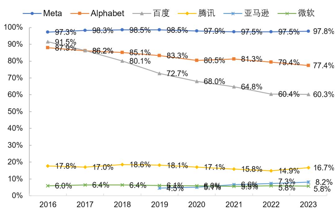 广告收入占中美主要互联网平台企业的比重。资料来源:根据各公司的财务报告收集整理。