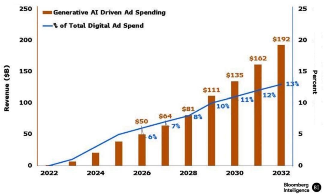 谈到广告,很多人都会轻蔑地笑。但是,不可否认,它几乎是每个企业的实际需要,也是宏观经济的晴雨表。我国希望大数据、虚拟现实、机器学习等新技术被命名为新一代信息技术。事实上,它们已经广泛应用于广告行业。美国国家经济研究局(NBER)工作文件认为(2018),在线广告定位和定价是人工智能目前最有利可图的两大用途之一。目前,生成型人工智能仍处于寻找商业模式的初始阶段,广告业已经成为最重要的落地场景之一。Sora出现后,第一个商业应用发生在数字广告领域——今年6月,玩具反斗城用Sora模型生成了近66秒的视频广告;混合元模型正式亮相仅4个月,腾讯就基于混合元推出了广告创意平台“妙思”。据彭博业研究资料显示,自2022年以来,由生成式AI驱动的广告支出迅速增加,预计2026年将达到500亿美元,占数字广告支出的6%。如图所示。