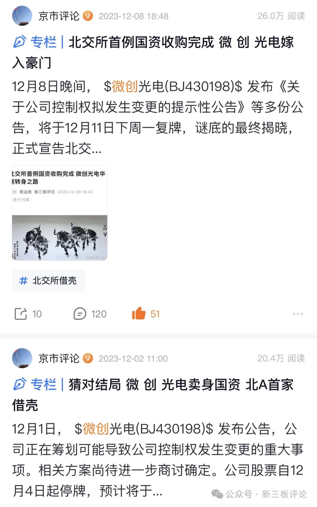 现在,北交所已经完成国有资产收购的第一个案例是去年底的微创光电,湖北省国有资产监督管理委员会也是收购主角。然而,它首先通过锁定价格成为单一第一大股东。固定价格到期12个月后,原一致行动人撤销一致行动协议,湖北省国有资产监督管理委员会正式成为公司实际控制人,正式完成北交所首次收购。早在2022年微创光电发布定增公告时,新三板评论就率先公开预测其将出售湖北省国有资产监督管理委员会。