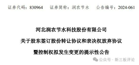 4、润农节水控制权转让的亮点在于“协议转让 表决权放弃 独特的股份安排方式“长期出让承诺”,完成了国资新股东以最快的速度成为实际控制人,属于北交所首例。