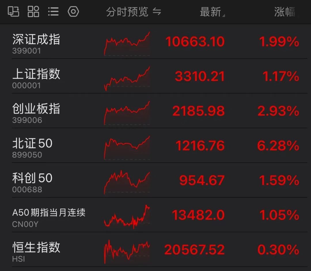 今天a股强势上涨,各大股指几乎以全天最高点收盘。科技成长股领涨,北证50指数上涨6.28%,创业板指数上涨2.93%,科技创新50%。、沪深300等都涨了1%以上。超过4500只股票标红,成交量缩水至1.72万亿元。